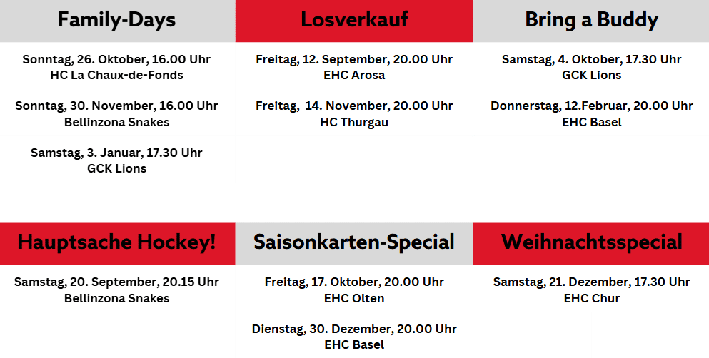 Für diese Spiele gibt es am Verpflegungsstand im Sektor C ein Familien-Sonderangebot: Ein Hot Dog und ein Getränk (4dl, non alc.) für CHF 7.00 pro Person. Nach dem Spiel empfängt die ganze 1. Mannschaft die jungen Fans auf dem Eisfeld für Autogramme und Fotos. Wir bitten alle Familien sich direkt nach Spielende im Foyer des Haupteingangs einzufinden.